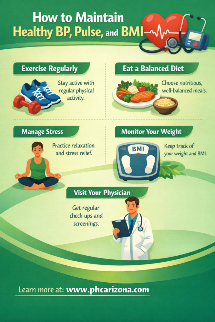 Maintaining healthy vital signs is essential for long-term health. Here are some practical tips for keeping your BP, pulse, and BMI in check: