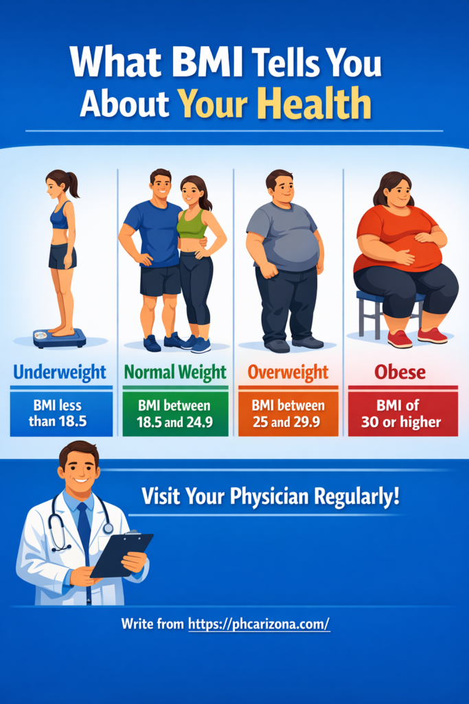 • BMI is an indicator of body fat based on your height and weight. It helps assess your risk for conditions like diabetes, heart disease, and other chronic health issues.
